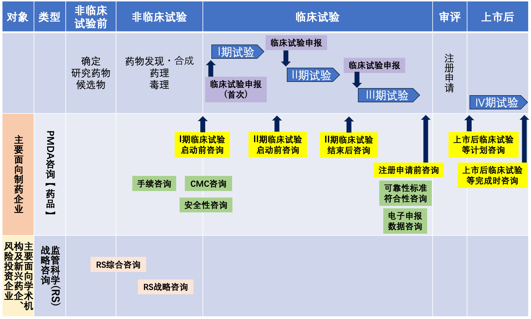 PMDA主要向大學(xué)、研究機(jī)構(gòu)和新興藥企、風(fēng)險(xiǎn)投資企業(yè),提供從藥品、醫(yī)療器械、再生醫(yī)療等產(chǎn)品的開(kāi)發(fā)產(chǎn)品候選物確定的最終階段到臨床開(kāi)發(fā)初期【直至概念驗(yàn)證試驗(yàn)(相當(dāng)于Ⅱ期早期試驗(yàn))】所需的臨床試驗(yàn)計(jì)劃制定等相關(guān)的指導(dǎo)和建議。