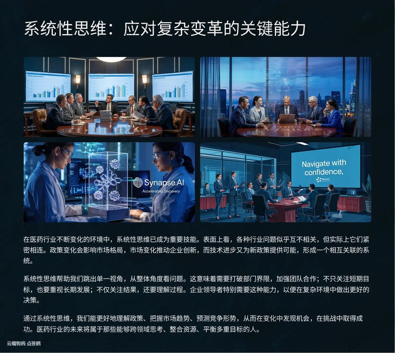 通過系統(tǒng)性思維,我們能夠更好地理解政策意圖、把握市場趨勢、預判競爭態(tài)勢,從而在變革中找到機遇,在挑戰(zhàn)中實現(xiàn)突破。醫(yī)藥行業(yè)的未來屬于那些能夠跨越多個領域、整合多種資源、平衡多重目標的系統(tǒng)性思考者。