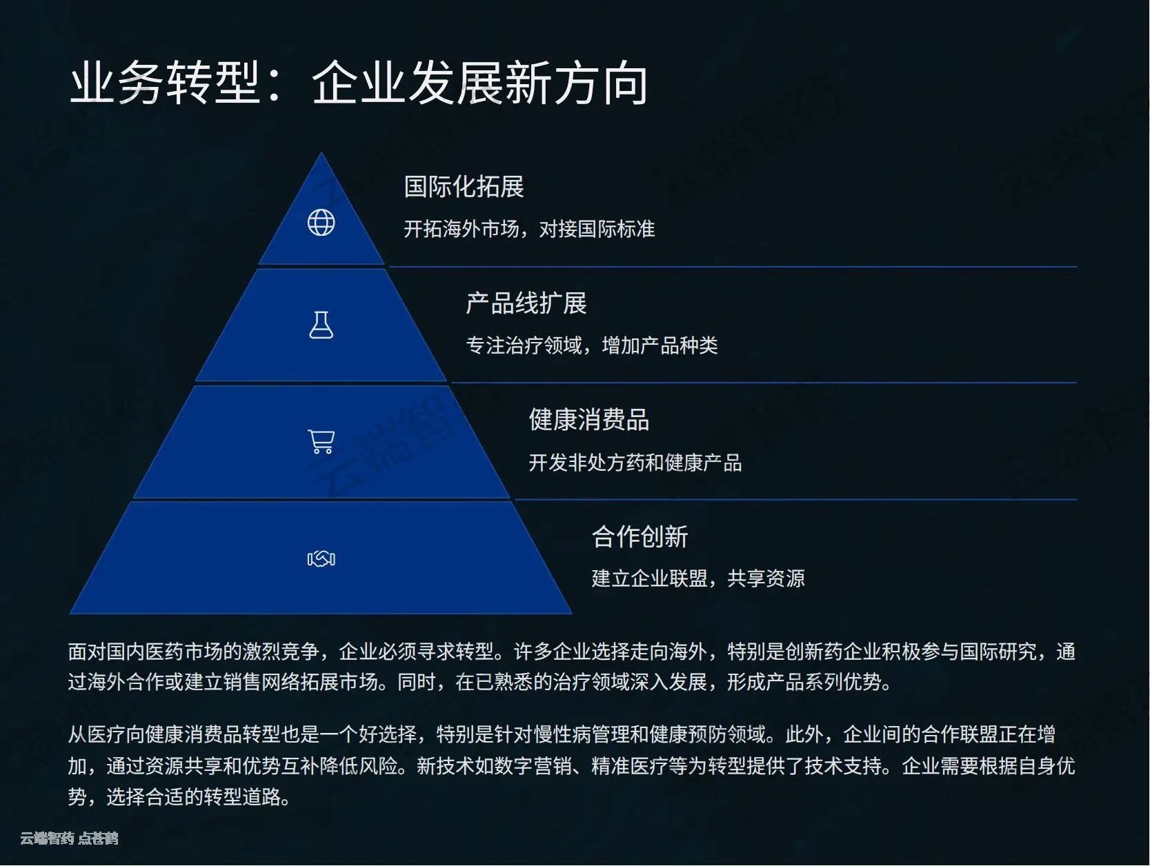 此外,"報團取暖"式的產業(yè)聯(lián)盟正在興起,通過資源共享和優(yōu)勢互補降低創(chuàng)新風險。新技術賦能,如數(shù)字化營銷、精準醫(yī)療和基因治療等,為轉型提供了技術支撐。企業(yè)需根據(jù)自身優(yōu)勢,選擇適合的轉型路徑。
