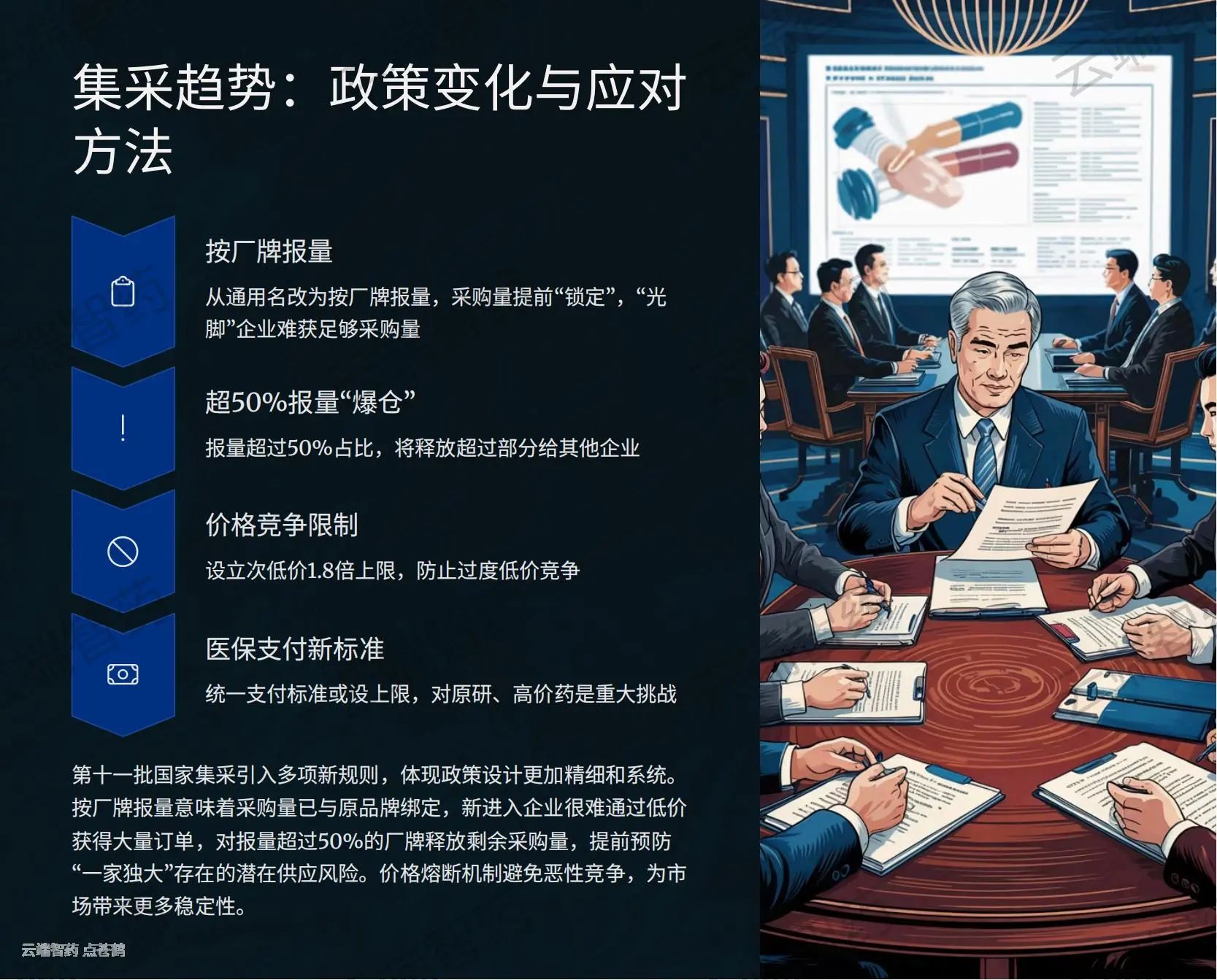 第十一批國家集采將帶來多項規(guī)則變革,彰顯政策設計的精細化與系統(tǒng)性。按廠牌報量意味著采購量提前“鎖定”原使用品牌,“光腳”企業(yè)很難再通過低價獲得較大采購量;超過50%的"爆倉"則對報量占比較大的品牌采取約束作用,提前預付供應風險。次低價1.8倍"熔斷"機制有效避免了過度低價競爭,為市場注入理性因素。