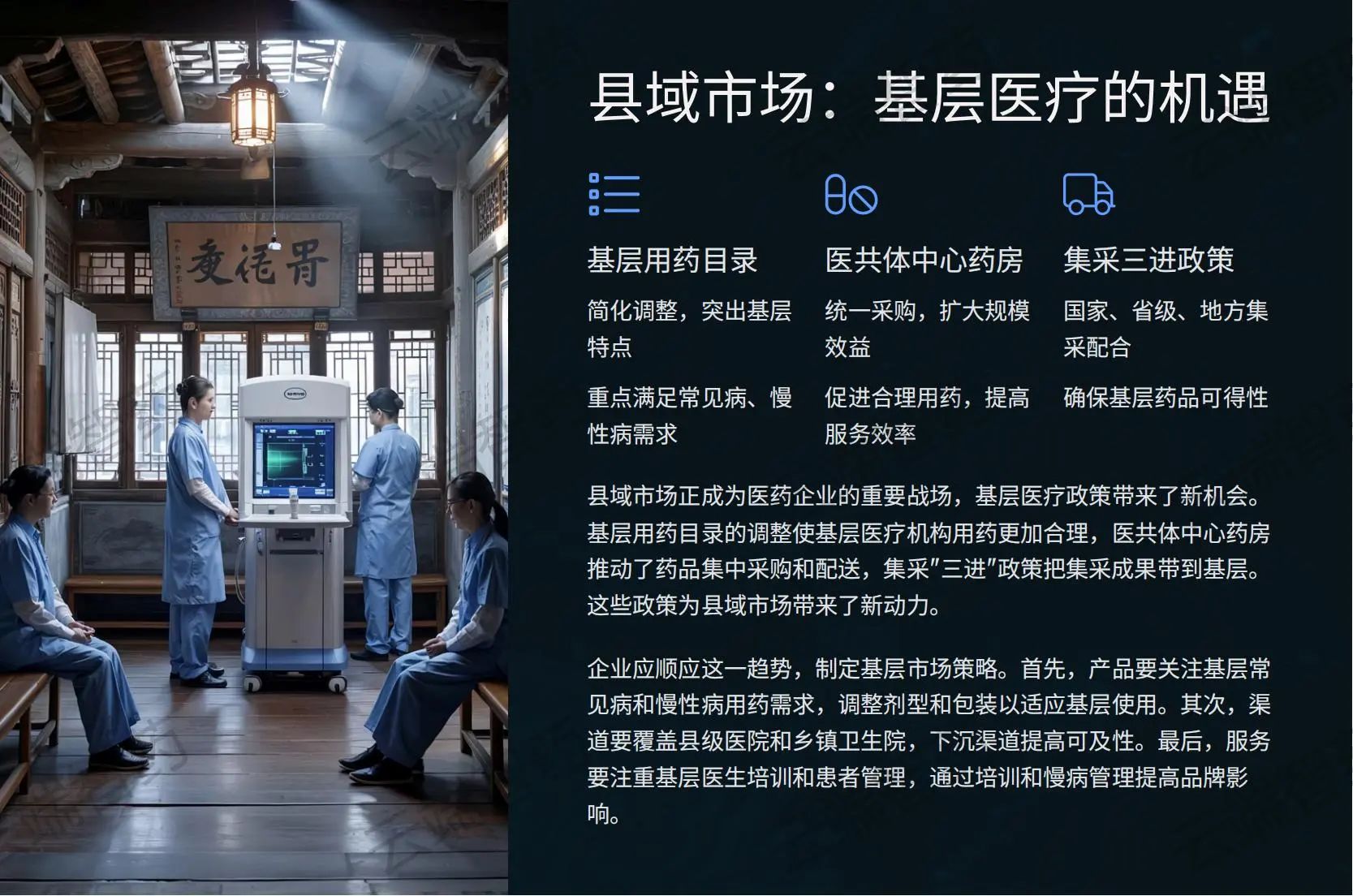 縣域市場正在成為醫(yī)藥企業(yè)必爭之地,基層醫(yī)療政策紅利逐步釋放?;鶎佑盟幠夸浀恼{整優(yōu)化使基層醫(yī)療機構的用藥結構更加科學合理,醫(yī)共體中心藥房建設推動了基層藥品集中采購和統(tǒng)一配送,集采"三進"政策確保集采成果深入基層。這些政策組合拳為縣域市場注入了強勁動力。
