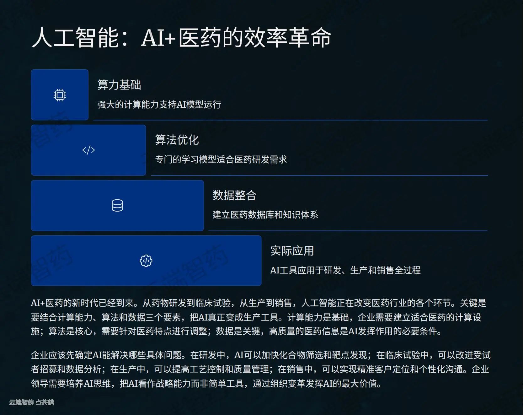 AI+醫(yī)藥時代已經來臨,從藥物發(fā)現(xiàn)到臨床試驗,從生產制造到市場營銷,人工智能正在重塑醫(yī)藥產業(yè)鏈的各個環(huán)節(jié)。關鍵在于如何整合算力、算法與算料三大要素,將AI工具真正轉化為生產力。算力是基礎,需要企業(yè)構建適合醫(yī)藥場景的計算基礎設施;算法是核心,深度學習等技術需要針對醫(yī)藥特點進行優(yōu)化;算料是關鍵,高質量的醫(yī)藥數(shù)據(jù)是AI發(fā)揮作用的前提。